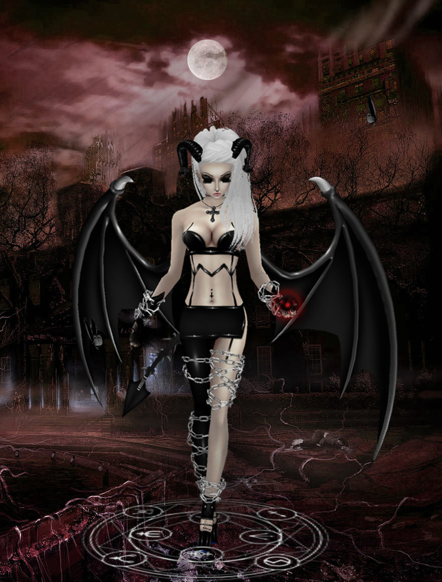 Nata dall'unione di un frammento gelido del cuore delle montagne caduto nelle bollenti fiamme degli inferi, sviluppò una pelle resistente alle temperature ambientali, capelli candidi come la neve, un cuore gelido, ali oscure e attraverso i suoi occhi si vedeva l'ardore dell'anima delle potenti fiamme infenali. La crescita con gli esseri dell'oltretomba l'hanno portata a diffidare e odiare qualsiasi creatura malvagia, la sua diversità fisica con loro creò in lei molti interrogativi della sua proveninza perciò cercò di fuggire dagli inferi ma la vastita di quel mondo era impressionante e si perse, l'istitnto di sopravvivenza la porto a scoprire che anche in lei celavano poteri magici, ma era cosi determinata che non si fermo davanti a nulla e vago per anni alla ricerca di risposte. Questi suoi poteri la affascinavano, si allenava ogni giorno, cercava spiegazioni su antichi libri, scopri cosi l'alchimia e le svariate combinazioni per creare pozioni e veleni che incrementassero la magia, la velocità e la resistenza. Creo perciò dopo svariati tentativi una pozione che rivelava le origi e fu allora che scopri tutto. La sua rabbia e il suo odio cresceva sempre di piu, non esitava ad uccidere. L'assenza di una patria la portarono a vagare di luogo in luogo alla ricerca di diventare sempre piu potente e crearsi un regno malvagio.